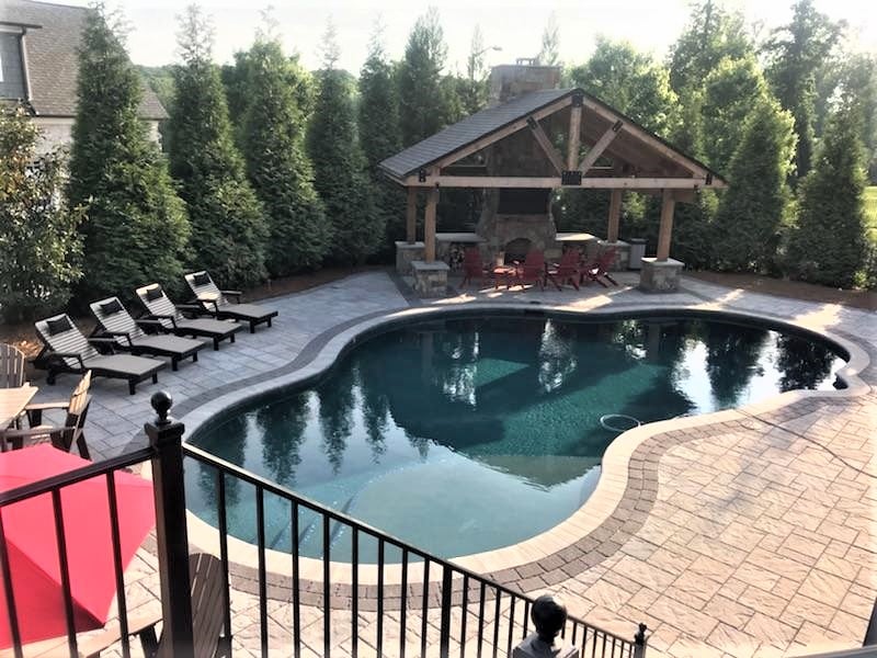 This freeform pool and outdoor fireplace is an outdoor space this large young family can enjoy year-round. The client wanted to be the “cool” backyard hangout for their friends and family so the pool space was designed with functionality in mind. While simplistic at first glance, the pool integrates seamlessly into the home’s existing beautifully landscaped yard. The flagstone fireplace, paver patio, outdoor tv, and shade structure offer a welcome respite for both kids and adults to enjoy after a long day in the sun.