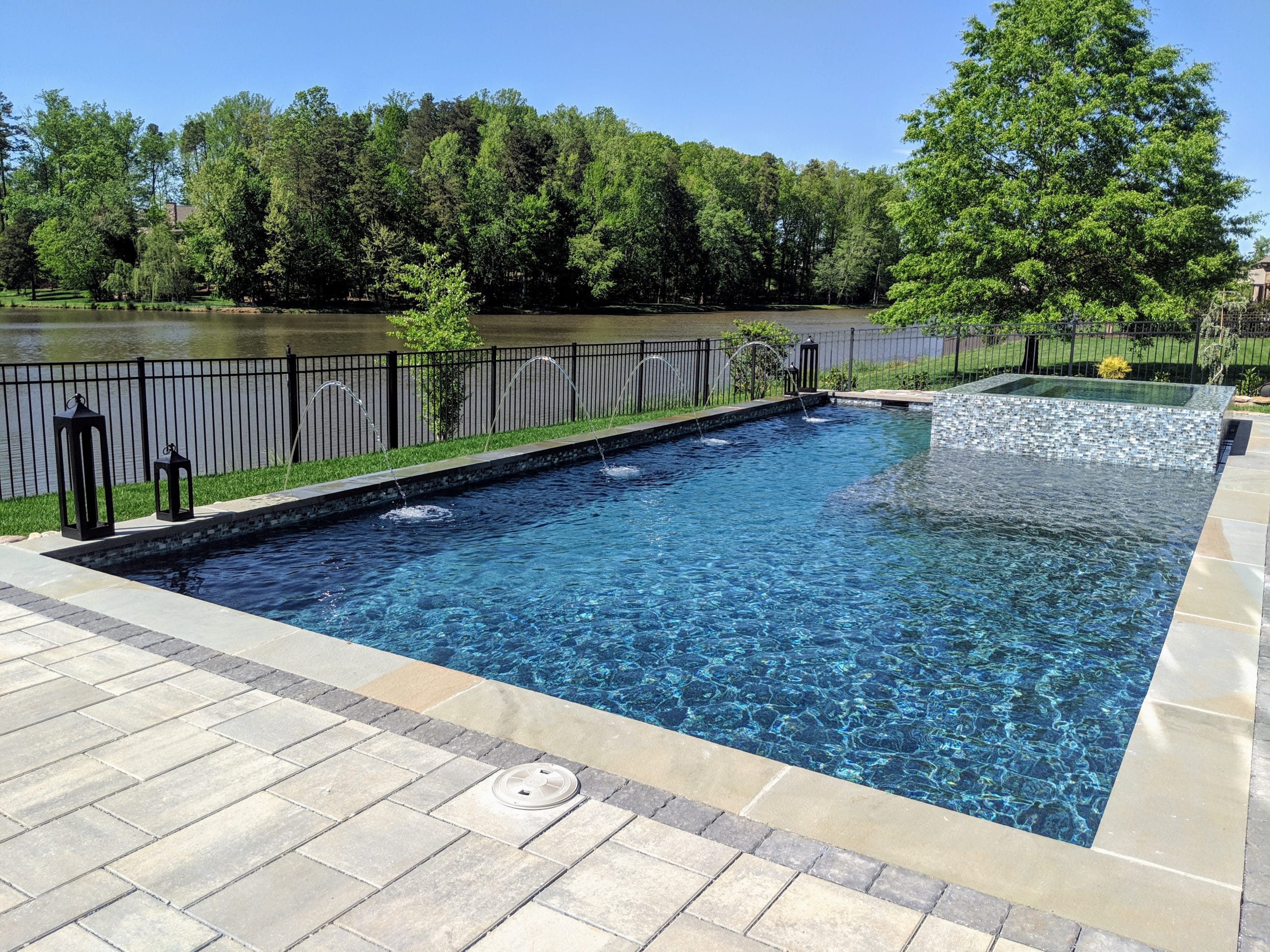 A tight space and water easement restrictions made this project compact but with a big impact. Colored laminars light up the space at night, while clear epoxy grout takes on the color of the multicolored glass tile on the spillover spa feature during the day. Majestic Sound Pebble Brilliance interior finish also adds some glamour to this pool. The result is a sleek plunge & party pool and spa combo for this bachelor pad.
